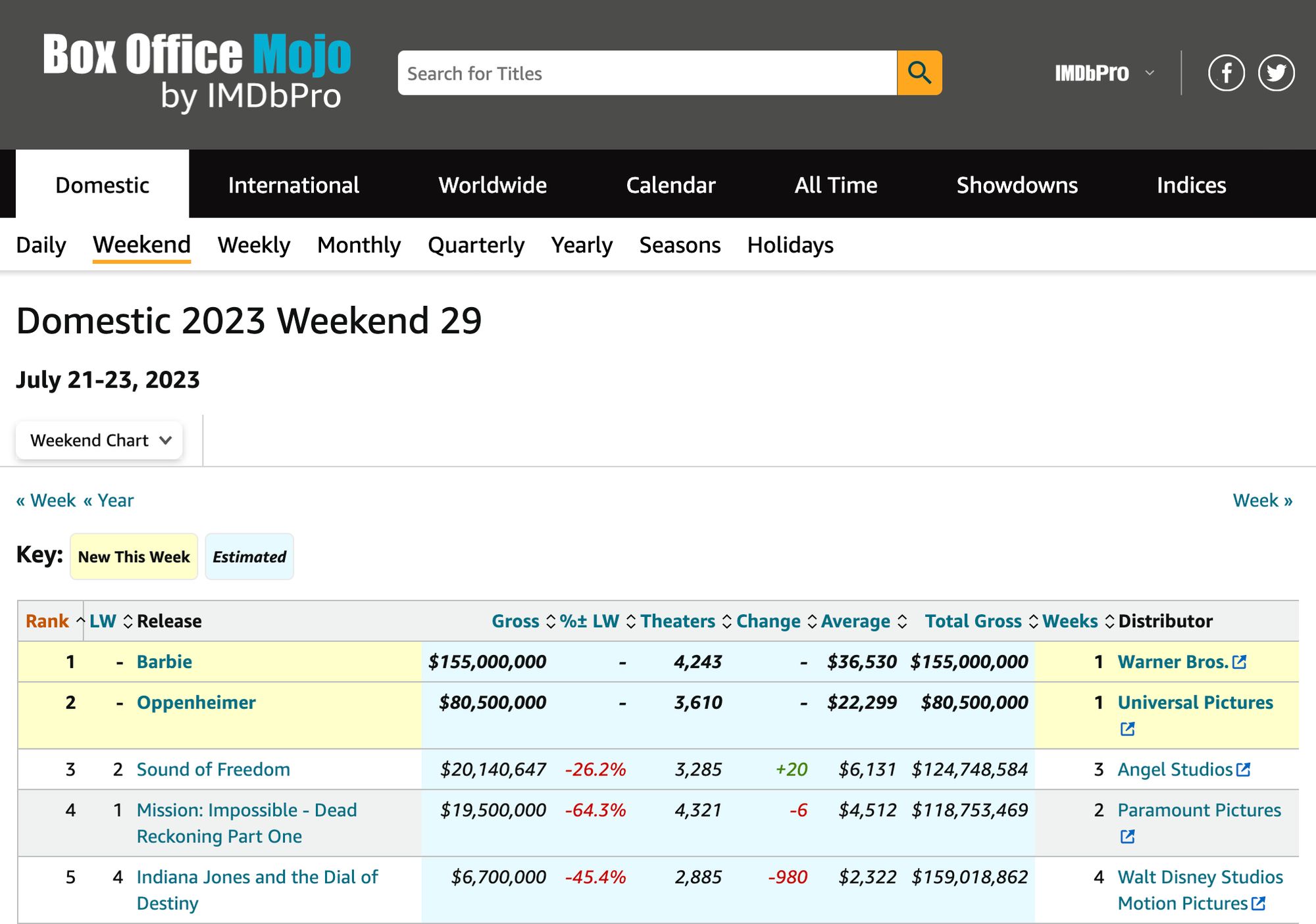 That little factoid, courtesy of Box Office Mojo by IMDbPro, is coupled with the fact that IMDB also places Sound of Freedom in third place for ticket sales for this past weekend (Friday, July 21 through Sunday, July 23), as follows