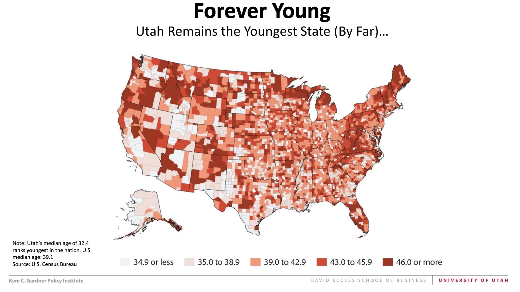 Notwithstanding this fact, Utah's median age of 32.4 years still ranks it as the lowest in the country, substantially lower than the median age of the entire country of 39.1 years (as shown in the graphic below).
