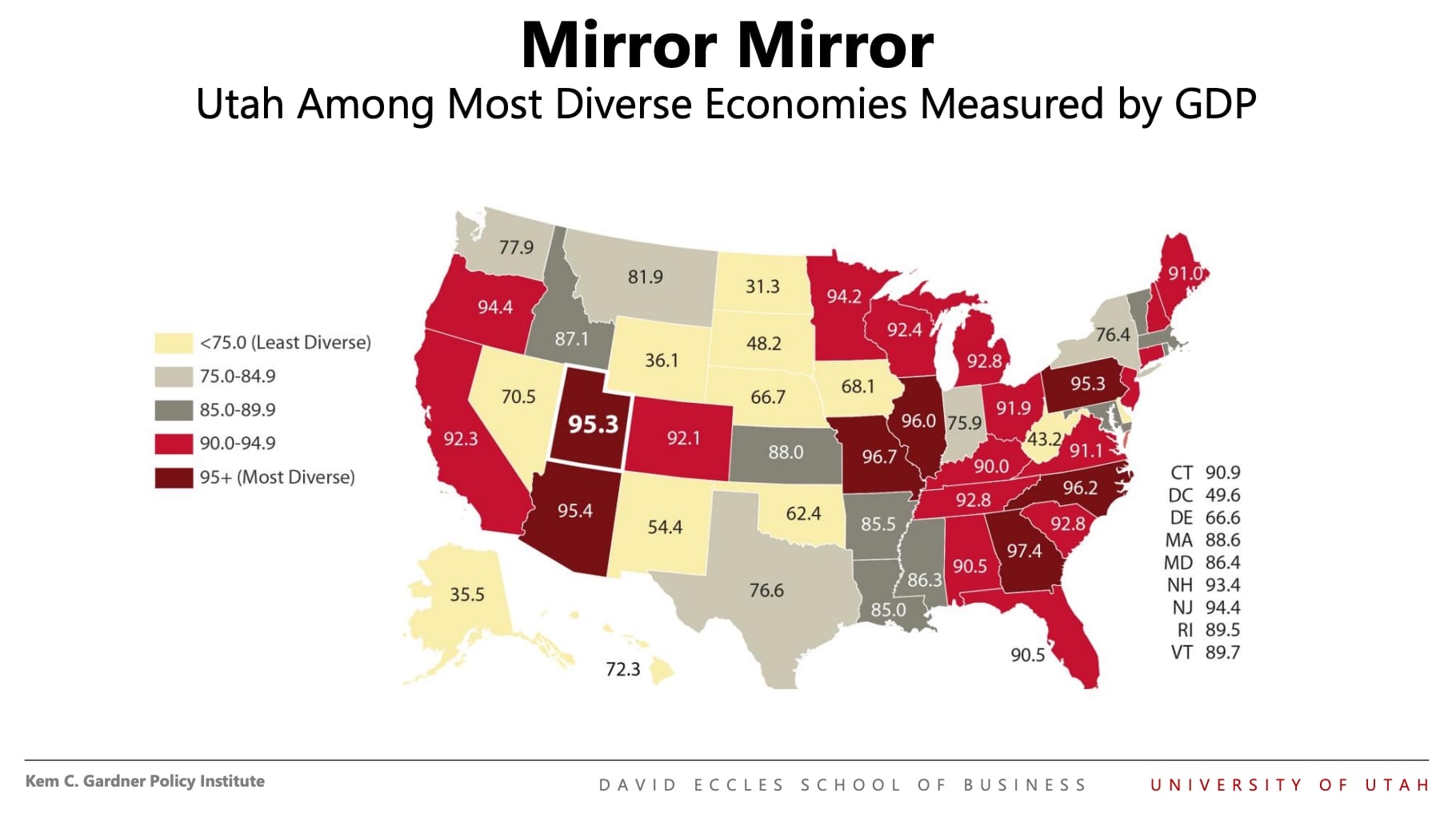 As noted in the graphic below, Utah is tied as the 7th-most economically diverse economy among states in the U.S., a distinction it holds with Maryland with scores of 95.3 out of 100.