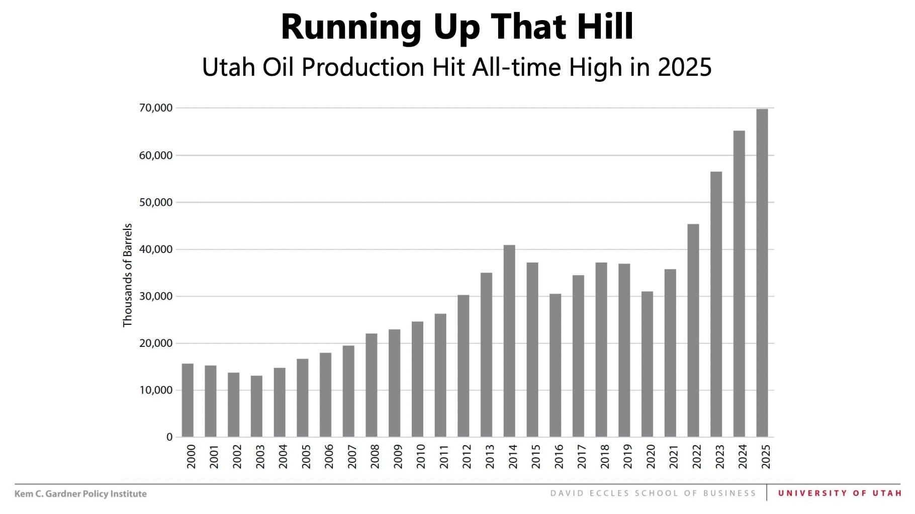 According to data published in the 2026 Economic Report for the Governor (and presented during last Friday's Summit), the state of Utah has achieved an all-time high in oil production of nearly 70 million barrels of oil produced annually (as shown in the graphic below).