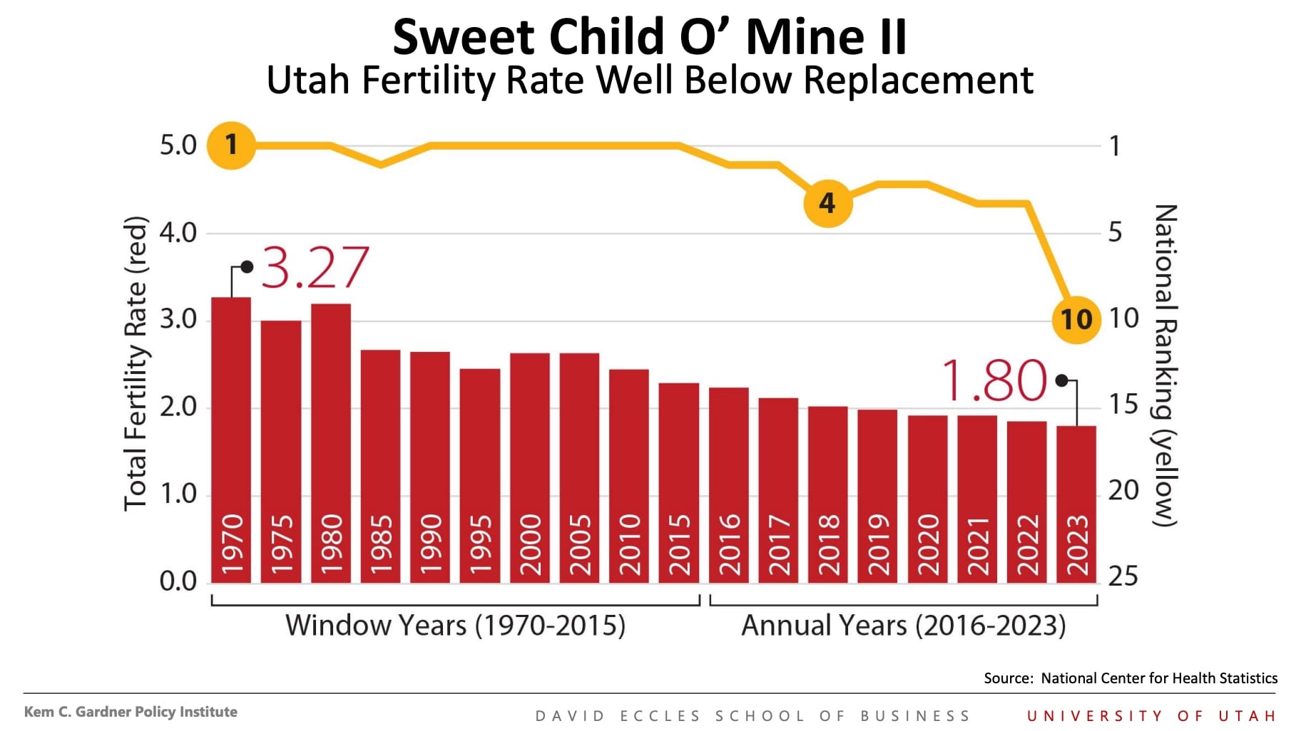 As noted above, Utah's birth rate has dropped to 1.8 births per family versus 3.27 births per family in 1970, a Total Fertility Rate that now ranks Utah at No. 10 in the U.S.